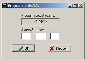 Amennyiben a programot véglegesíteni szeretnénk, el kell végeznünk az aktiválást. Ehhez a 6.3 pontban, illetve a program fejlécében olvasható program 6 jegyű sorozatszámot kell elküldenünk a golden@goldenkkt.hu címre. Válaszképp egy 9 jegyű kulcsot kapunk 111-222-333 formában. Ezt kell ebbe az ablakba begépelnünk. Ezt a műveletet csak egyszer kell elvégeznünk, utána a menüpont neve is átalakul, lásd következő pontot. |