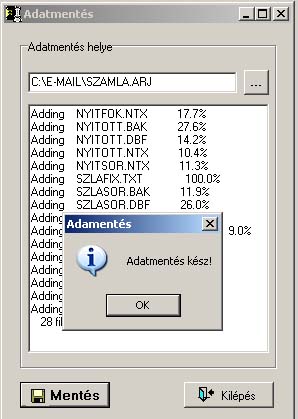 Ezzel a menüponttal tudjuk adatainkat elmenteni. A mentés funkciót egy úgynevezett archiváló program végzi, ami 'összecsomagolja' az adatokat egyetlen adat file-ba, amelynek a neve ARJ-re végződik. Ezt a mentés állományt az általunk megadott helyre írja fel a program. Az így elmentett archív állomány akár levél mellékletként is küldhető. |
